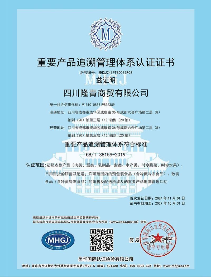重要产品追溯管理体系认证证书